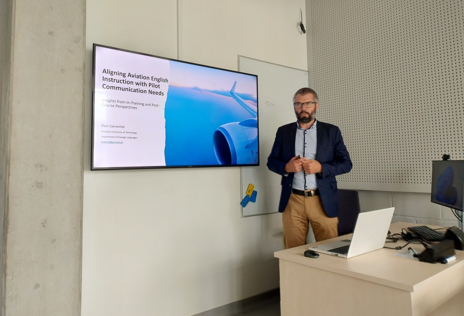 Podczas wydarzenia wyniki kompleksowej analizy dotyczącej „Dostosowania nauczania języka angielskiego w lotnictwie do potrzeb komunikacyjnych pilotów: Badanie porównawcze uczestników szkolenia ATPL” przedstawił dr Piotr Czerwiński z Centrum Języków Obcych Politechniki Rzeszowskiej. Szczególną cechą badania było jego porównawcze podejście, które objęło trzy grupy studentów: tych rozpoczynających szkolenie (1. semestr), będących w jego środku (3. semestr) oraz tych, którzy już ukończyli formalny kurs Aviation English i zbliżają się do praktyki zawodowej. Taka perspektywa pozwoliła na uzyskanie dynamicznego obrazu zmieniających się potrzeb językowych i wyzwań na różnych etapach rozwoju przyszłego pilota.