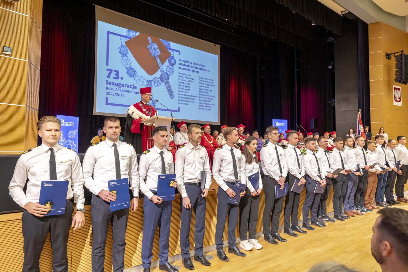 Po odśpiewaniu przez Chór Akademicki Politechniki Rzeszowskiej Gaudeamus Igitur zostały wręczone certyfikaty ukończenia szkolenia do licencji pilota komunikacyjnego. Tę część uroczystości poprowadził prorektor ds. rozwoju i współpracy z otoczeniem prof. dr hab. inż. Jarosław Sęp. W tym roku 23 studentów kierunku lotnictwo i kosmonautyka, specjalności „pilotaż” zakończyło szkolenie i uzyskało certyfikat. Certyfikaty i pagony pilotom wręczyli JM Rektor i dyrektor Ośrodka Kształcenia Lotniczego dr inż. Arkadiusz Rzucidło.