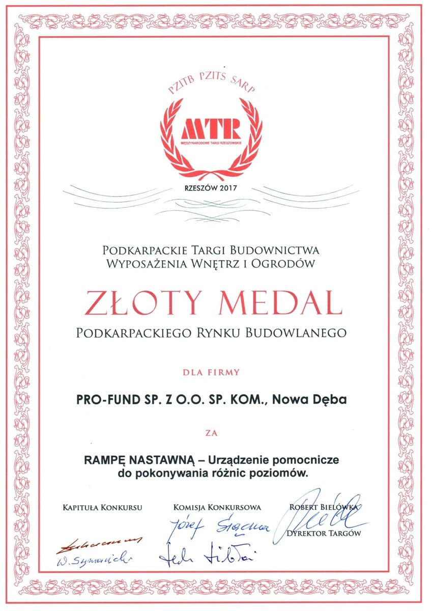 Wynalazek pracowników Katedry Konstrukcji Maszyn PRz dr. hab. inż. Sławomira Miechowicza, prof. PRz, i mgr. inż. Pawła Fudalego (prawo do patentu zostało sprzedane przez naszą uczelnię firmie PRO-FUND w 2012 r.) podczas 22. Targów Budownictwa, Wyposażenia Wnętrz i Ogrodów EXPO DOM otrzymał Złoty Medal Podkarpackiego Rynku Budowlanego. Nagrodzone urządzenie to rampa nastawna.